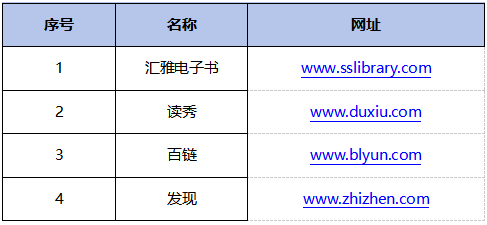 经学校领导与集团沟通协调,经图书馆与超星集团协商,超星集团现已同意为我校图书馆开通下列电子图书、电子期刊等100余万种资源试用,并于今天开通。学科包括哲学、政治、经济、军事、文学、艺术、历史地理、社会科学、自然科学、生物科学、工业技术、医疗卫生、农业科学、交通运输、航空航天等。这些电子资源的开通,不仅极大地丰富了我校图书馆的馆藏资源,同时也为学生的学习生活、业余生活、提升个人素养,为教师和科研人员教学科研能力的提升提供了图书情报保障。各电子资源的网址如下表所示。