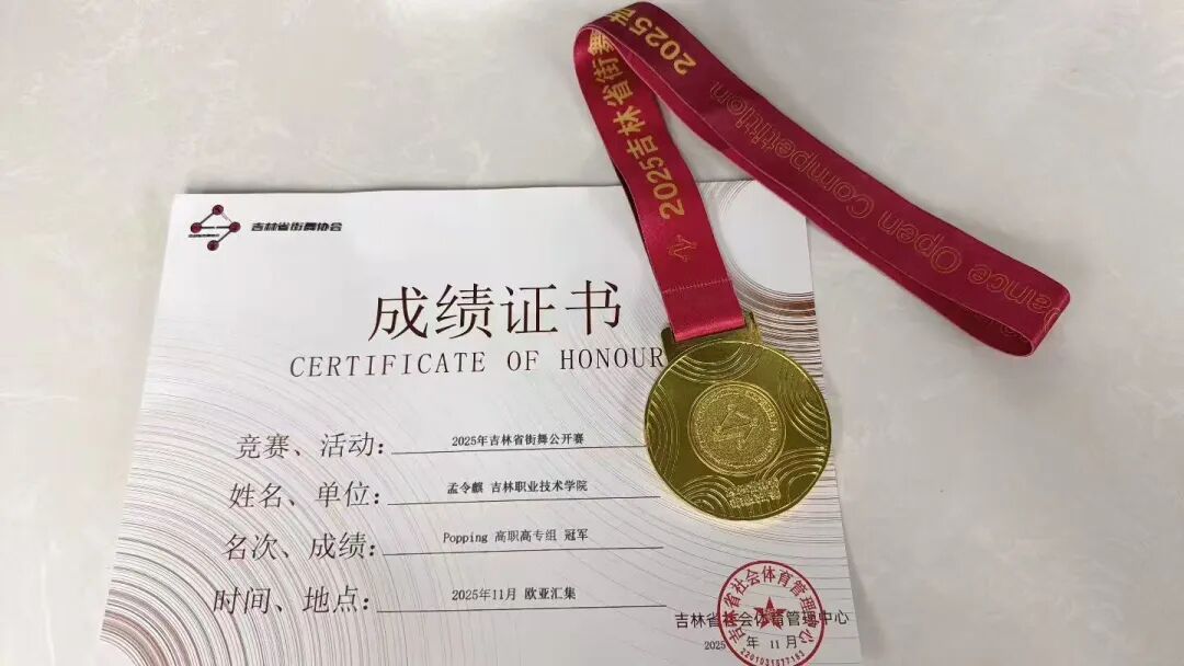 (通讯员 王宁)动感旋律燃动赛场,精湛舞姿定格荣光。11月23日,吉林省街舞公开赛顺利收官,我校孟令麒同学凭借稳定发挥与强劲实力,勇夺高校高职高专组Popping斗舞项目冠军,这份亮眼战绩的背后,离不开指导教师王迪的悉心耕耘与无私付出,每一份荣誉都镌刻着师者的坚守与匠心。