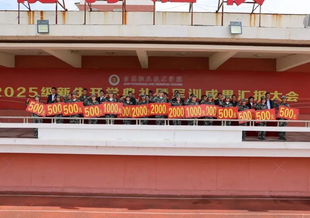 颁奖环节后,校领导为15名2025级新生代表佩戴校徽。熠熠生辉的校徽不仅是学校精神的象征,更承载着对新生的期许。校徽代表着吉职学子的身份与荣誉,希望新生们能牢记校徽背后的责任,以实际行动为校争光。