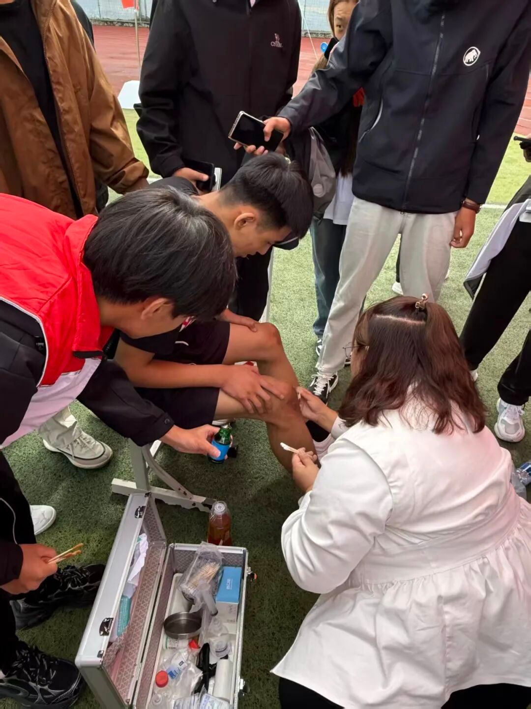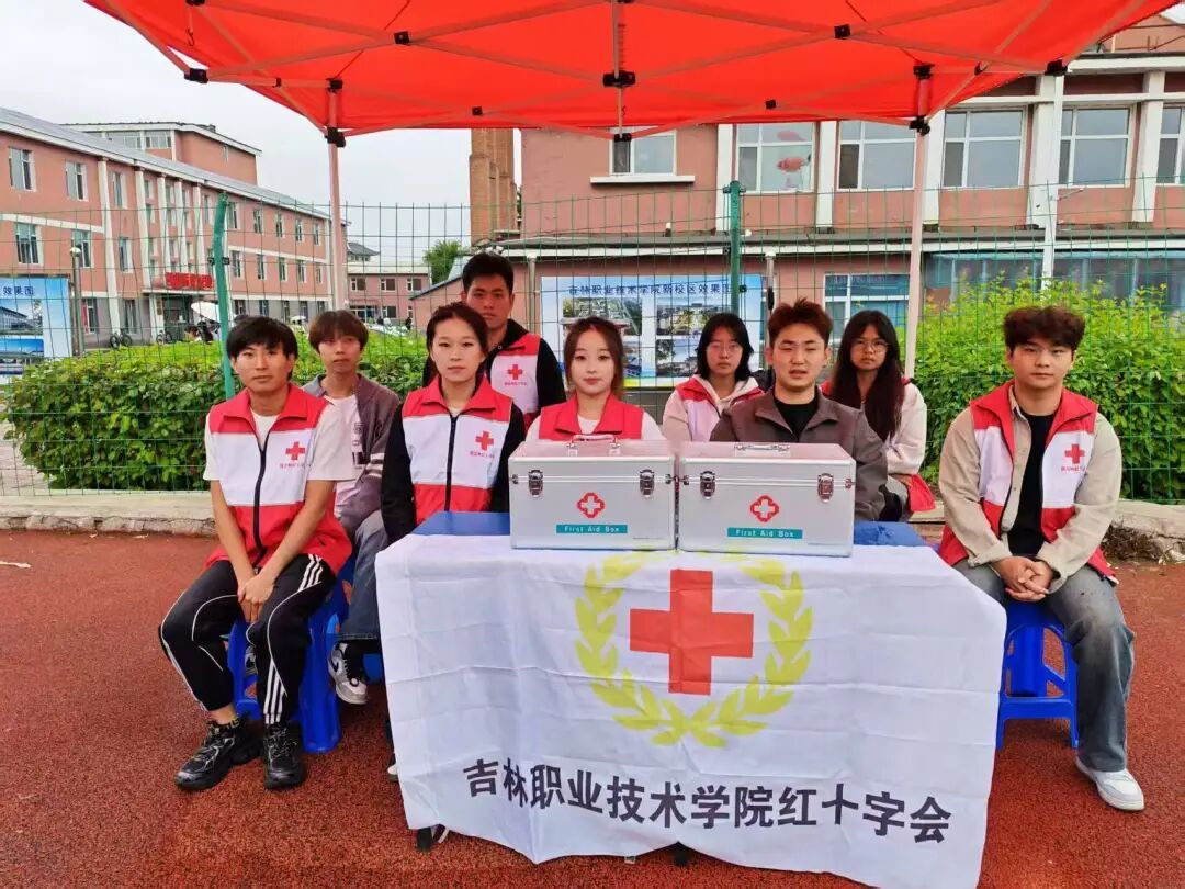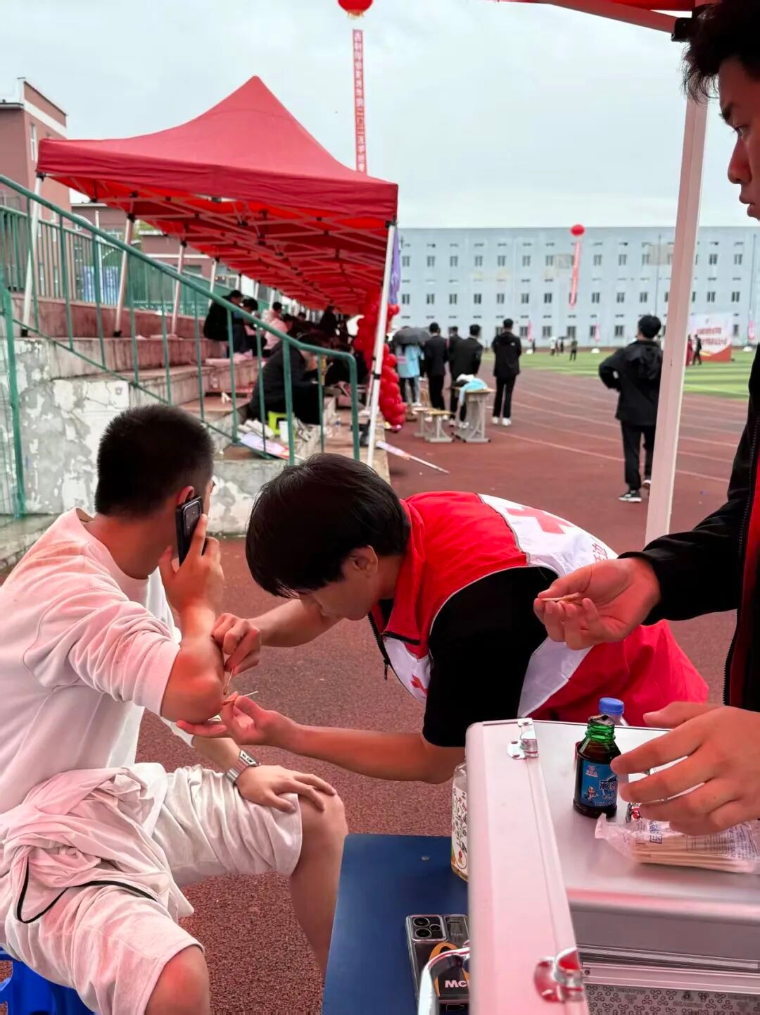 清晨7时,天还带着微凉,在医务室陈昱老师的带领下红十字志愿者已提前抵达操场,分成两组在跑道旁和看台侧搭建2个临时救护点。大家蹲在地上分工协作:有人清点生理盐水、碘伏、弹性绷带等急救物资,将其分类摆进铝合金急救箱;有人调试血压计、听诊器,确保仪器灵敏;还有人摆放塑料凳子、整理医疗废物袋,为应急处置和人员休息做足准备。“运动员在赛场拼搏,我们得把细节落好,关键时刻才能顶得上。”志愿者组长一边核对物资清单,一边叮嘱伙伴。此刻的他们,像赛场边缘的“安全哨兵”,身影隐在人群中不显眼,目光却时刻扫视着赛场每一个角落,为即将开始的赛事织就隐形的安全网。
