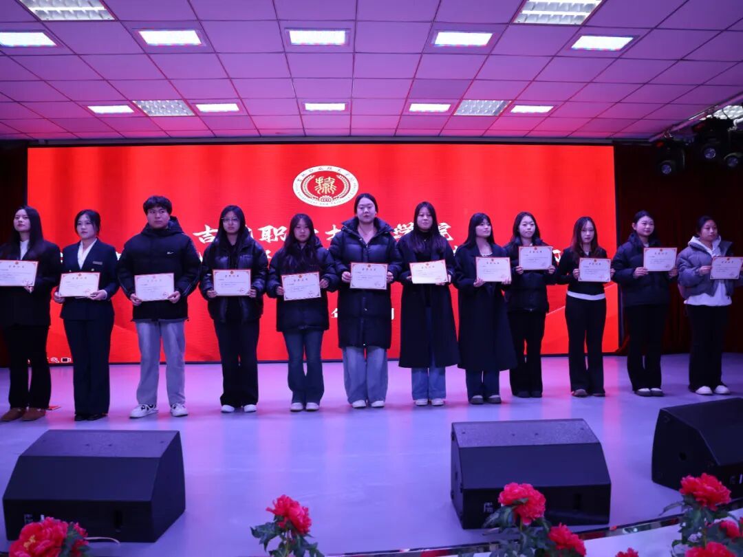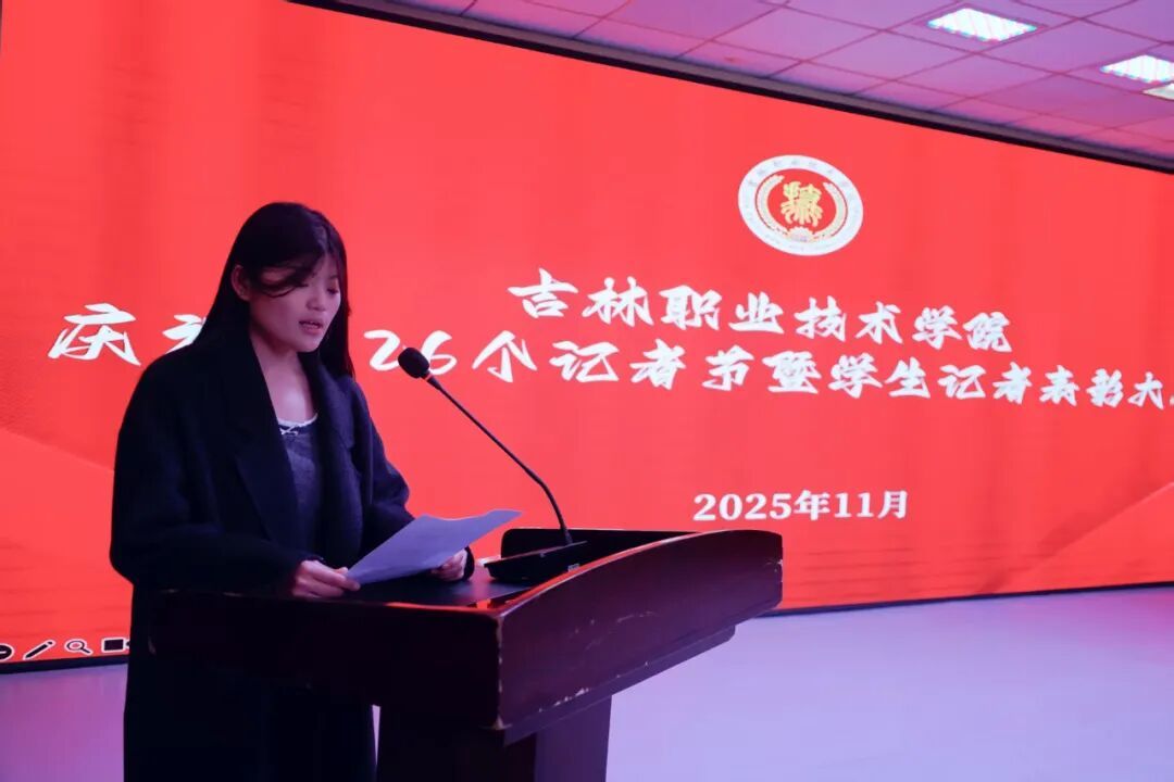 记者代表郭贝贝同学上台分享成长感悟。她坦言初涉校园新闻时,拍摄、撰稿皆显生涩,幸得老师指导与团队帮助,才逐步掌握用镜头定格温暖、以文字传递青春的能力。郭贝贝表示,这份荣誉既是对过往努力的认可,更是未来前行的动力,未来将继续深耕校园,挖掘更多精彩故事,传递吉职正能量。