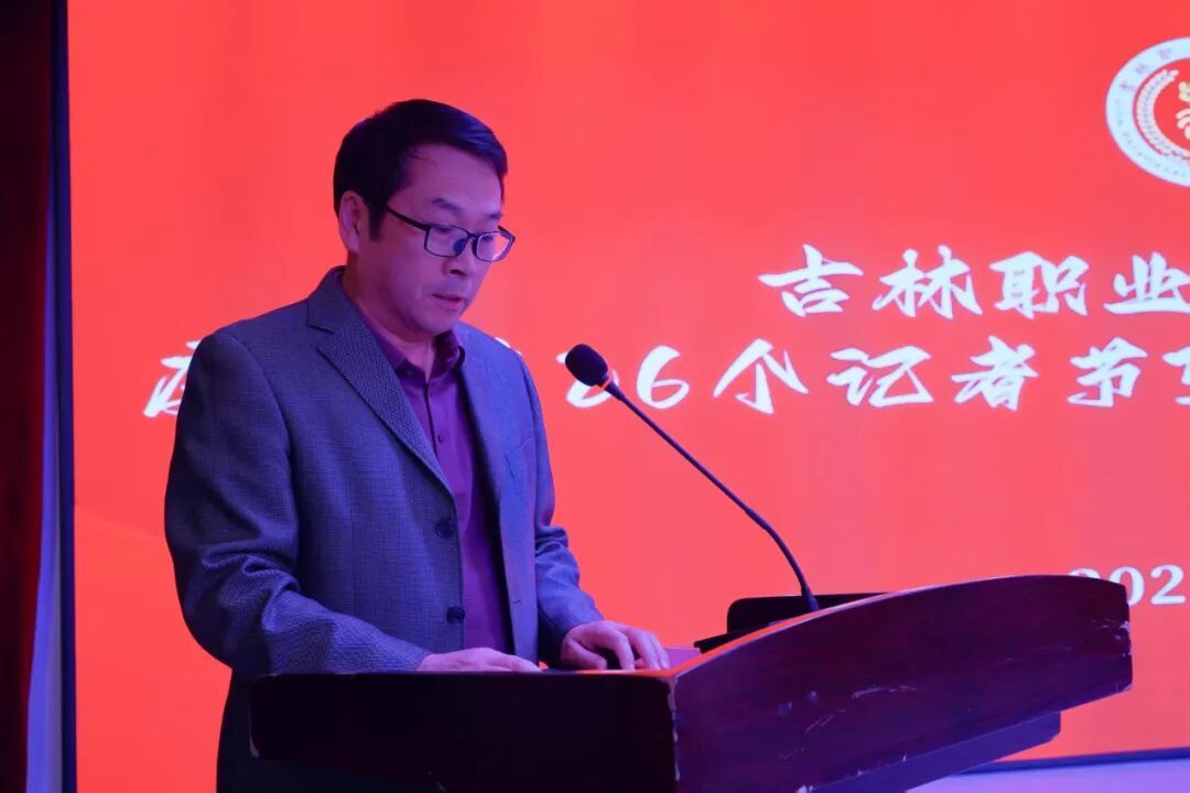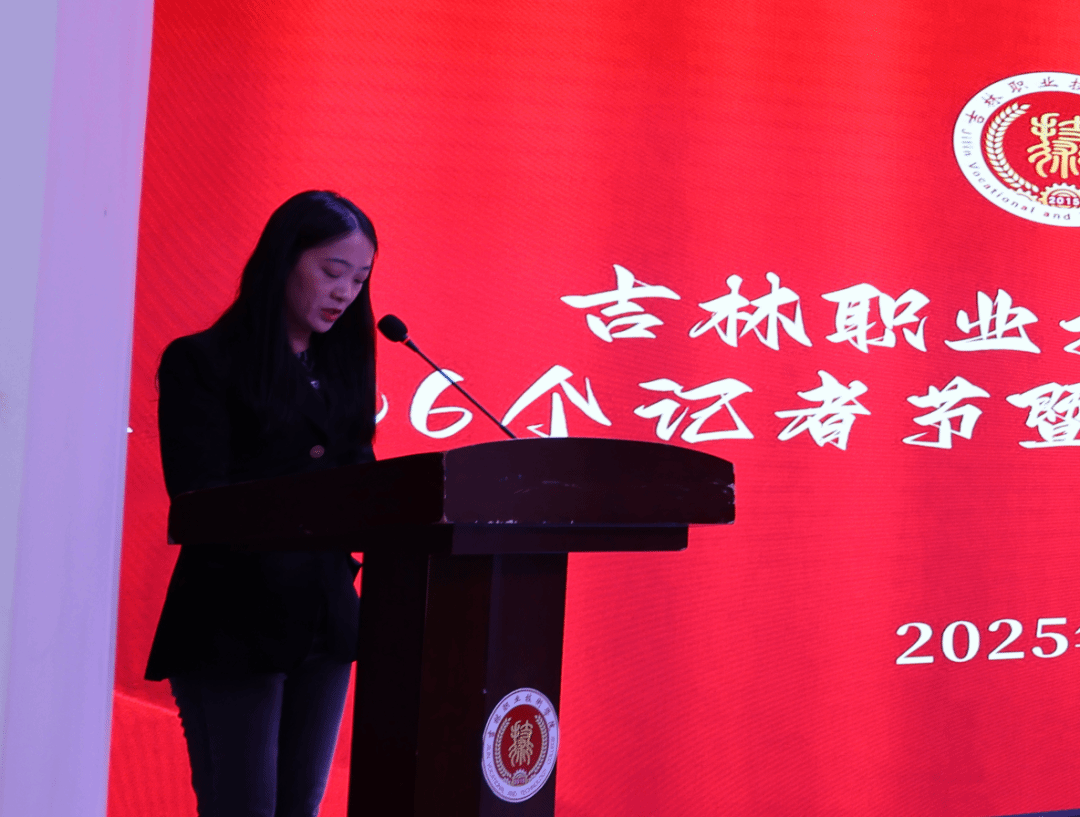 党委宣传部部长段世娇为大会致辞。她首先向获得表彰的优秀学生记者表示热烈祝贺,向全校默默奉献的学生记者团队送上节日的问候。段世娇指出,过去一年里,学生记者们活跃在校园的各个角落——开学典礼上有他们记录新生风貌的身影,运动会上有他们追踪赛事亮点的脚步,学术活动中有他们传递知识力量的文字,正是这些鲜活的记录,让吉职的校园文化更具生命力,让学校的发展故事更有感染力。“学生记者是校园宣传的‘生力军’,是连接学校与师生、社会的‘桥梁纽带’。”她对同学们提出殷切期望,希望大家始终保持对新闻事业的热爱与敬畏,既要锤炼敏锐的新闻视角,善于发现校园中的真善美,也要坚守真实客观的新闻准则,用有温度、有深度、有力度的作品,讲好新时代的吉职故事,展现吉职学子的良好精神风貌,为学校高质量发展注入青春动能。