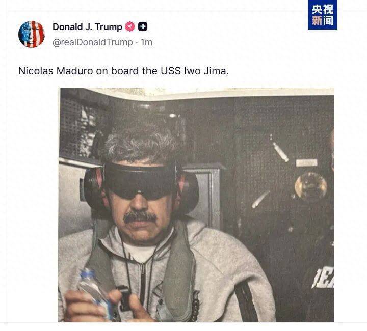 当地时间1月3日,特朗普在其社交平台“真实社交”(Truth Social)上发布了一张马杜罗在“硫磺岛”号军舰上的照片。照片中的马杜罗戴着手铐,双眼被黑布蒙住。