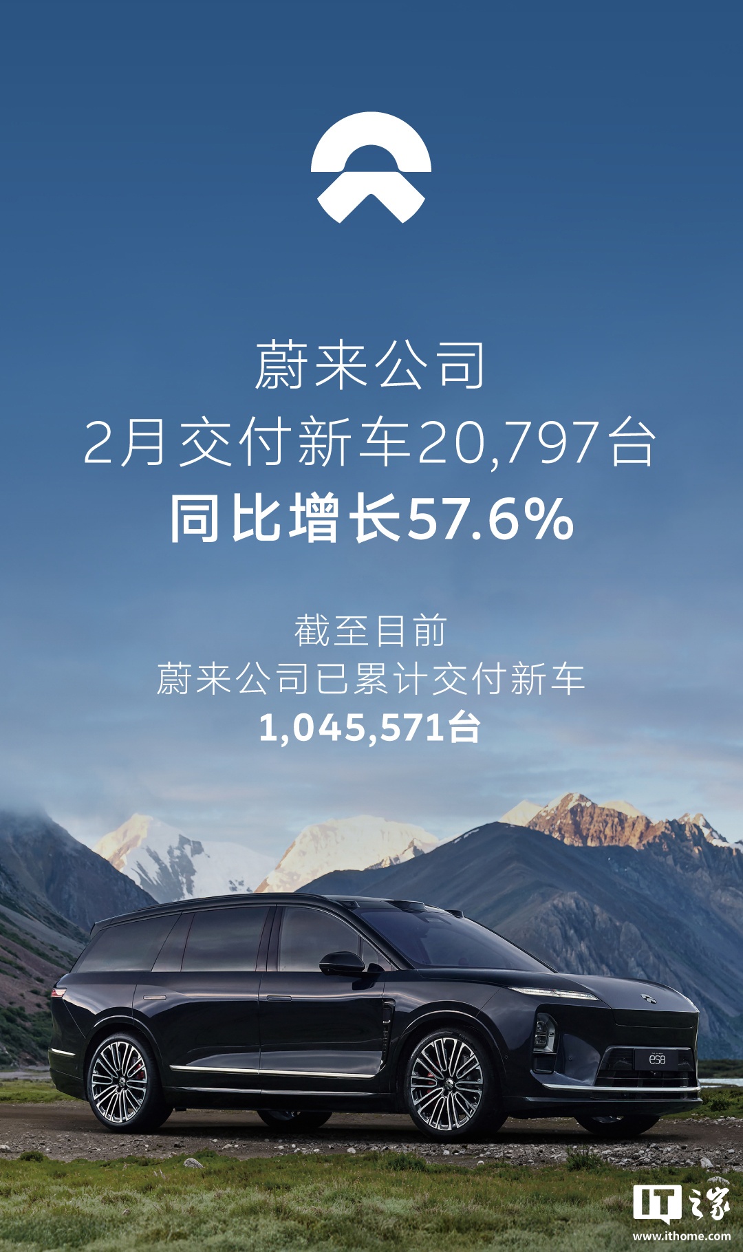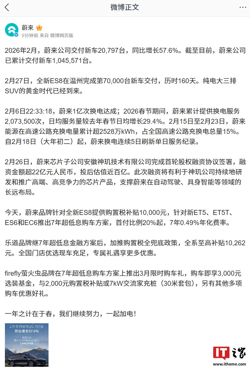 IT之家 3 月 1 日消息,蔚来官方今日宣布,2026 年 2 月,蔚来公司交付新车 20,797 台(超 2 万台),同比增长 57.6%。截至目前,蔚来公司已累计交付新车 1,045,571 台(超 104 万台)。