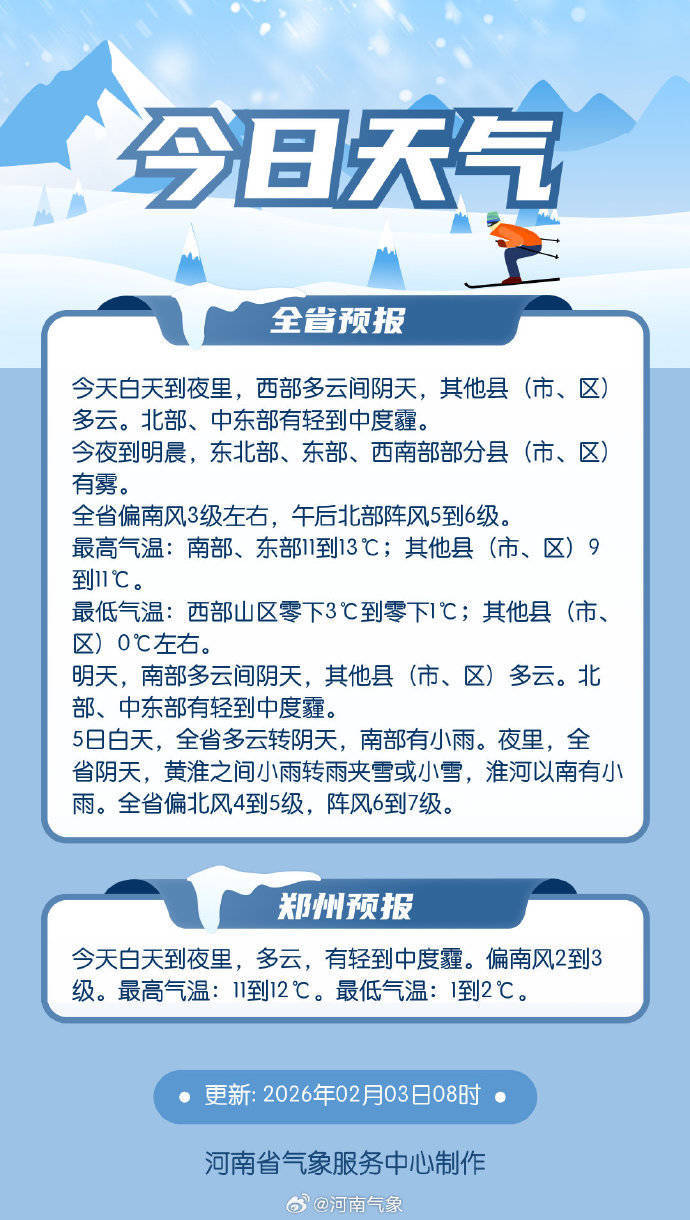 2月3日,据河南气象,今天白天到夜里,西部多云间阴天,其他县(市、区)多云。北部、中东部有轻到中度霾。 今夜到明晨,东北部、东部、西南部部分县(市、区)有雾。 河南全省偏南风3级左右,午后北部阵风5到6级。